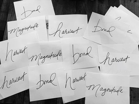 i’ve referenced these lines before, in the titling of another painting from late 2023 (“gwendolyn brooks is correct, we are each other’s harvest, business, magnitude, & bond”), but i remember at the time seeing the words harvest, magnitude, & bond as individual, brightly colored flashes of neon text in my mind’s eye. each word blinked on and off, one after the other, in a rhythmic fashion, as if synchronized with music.